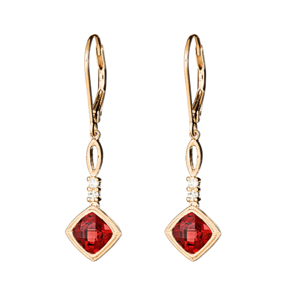 14k yellow gold 2.72ctw cushion cut Garnet and .10ctw diamond dangle earrings