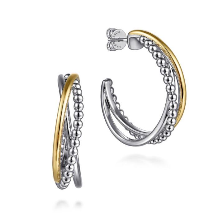 Sterling Silver and 14k yellow two-tone gold multi-row Bujukan style J Hoop earrings with post