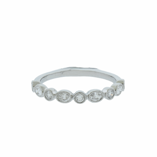 14k white gold alternating pattern oval and round diamond wedding band with milgrain edge design