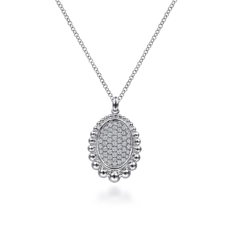 Sterling Silver Bujukan style necklace with .49ctw pave set white sapphires in oval design on 17.5″ adjustable chain